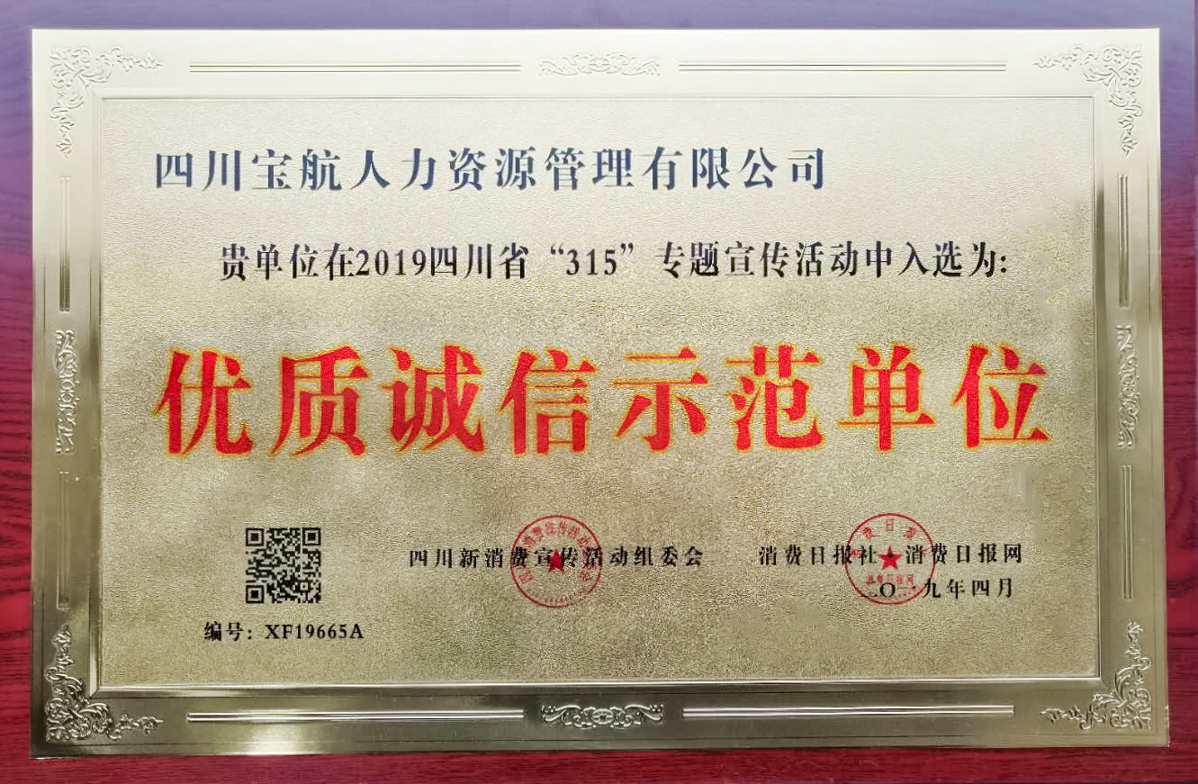 2019年3月21日,四川省人才服务行业协会第三届十次常务理事会在成都召开,宣布并表彰了2018年度人力资源服务行业 16家机构等级的提议、关于评选2018年度四川省人力资源服务业“诚信服务示范机构”“诚信服务机构”的提议、关于评选“2018年度大学生就业创业服务先进单位”的提议和关于表彰2018年度优秀通讯员的提议。四川宝航公司获得“优质诚信示范单位“称号。这是全公司员积极进取、奋发图强、争创一流的结果。