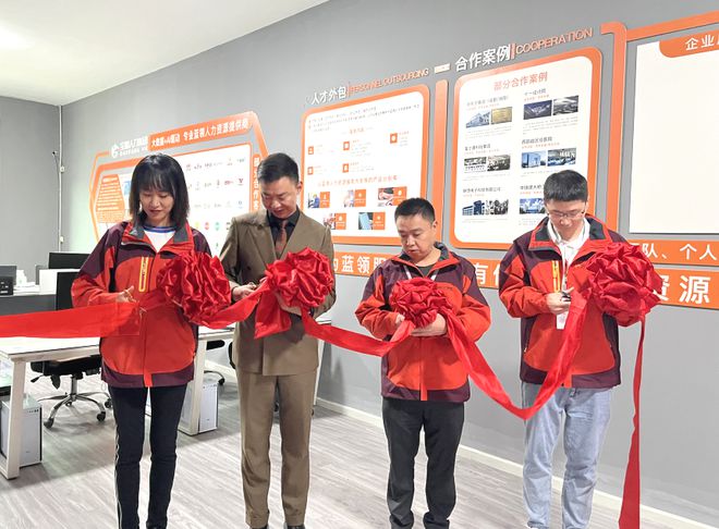 宝航人力集团创始人、董事长黄栋(左二),事业二部总监李雪婷(左一),总裁特助王建英(右二),事业二部BPO项目经理赵立章(右一)等人现场参与了开业仪式。上午11点整,正式举行剪彩开业仪式,双流运营部人员共同见证这一历史时刻。