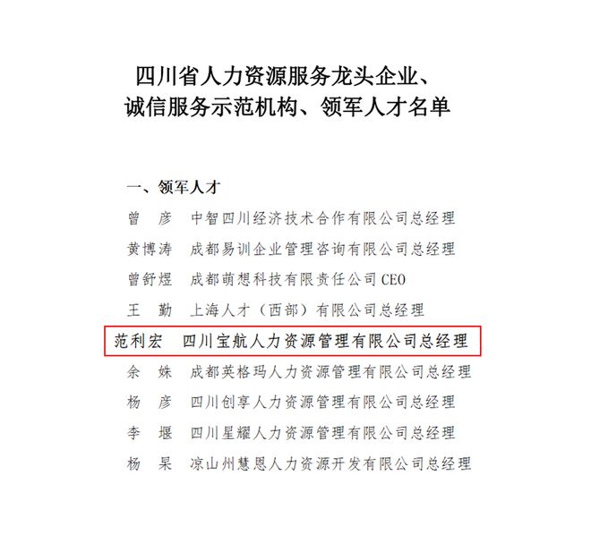 9月25日,四川省人社厅公布了2023年度人力资源服务骨干企业、领军人才、诚信服务机构名单。四川宝航人力资源管理有限公司总经理范利宏被授予“领军人才”称号。